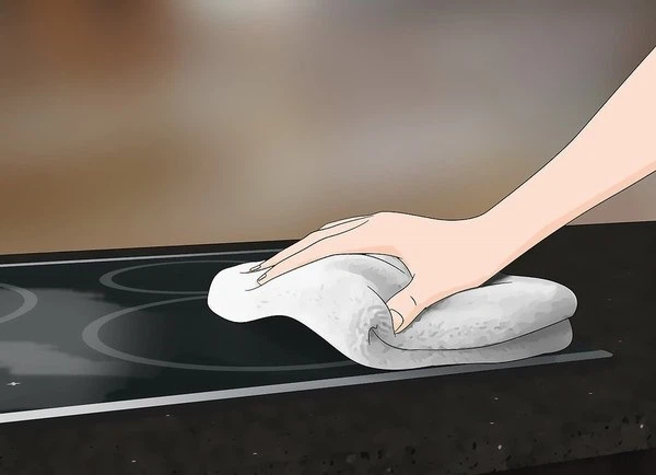 - Bước 4: Sau 15 phút, bạn dùng khăn ẩm lau xung quanh bề mặt kính bếp từ. Thực hiện từ 2 – 3 lần để cho bếp từ sạch hoàn toàn. Sau đó sử dụng một chiếc khăn khô khác để hút ẩm và lượng Baking Soda còn dư trên mặt bếp. Như vậy là đã hoàn tất cách vệ sinh mặt kính bếp từ bằng Baking Soda nhanh chóng và cực kỳ sạch. Mặt bếp sau khi lau xong sẽ sáng loáng trở lại vẻ đẹp ban đầu.