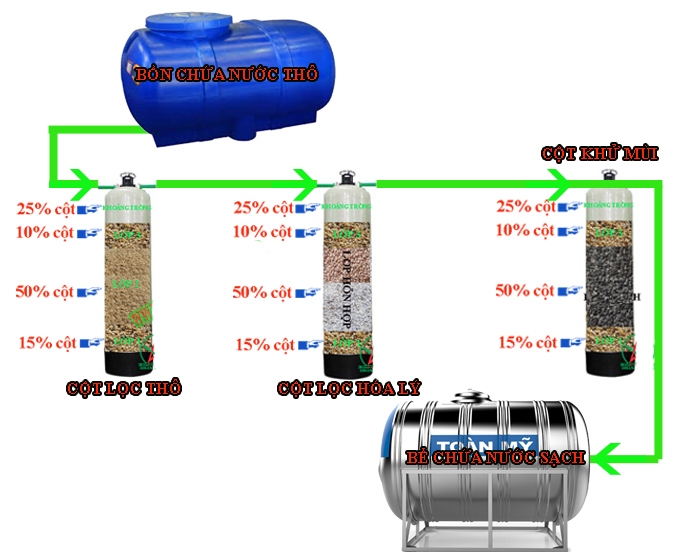 Quy trình lọc diễn ra như sau: Nguồn nước sẽ lần lượt được chảy qua các lớp lọc. Mỗi lớp lọc có chức năng giữ lại cặn bẩn, tạp chất, phèn… trong nước, nhờ đó nguồn nước sẽ được trong sạch hơn.